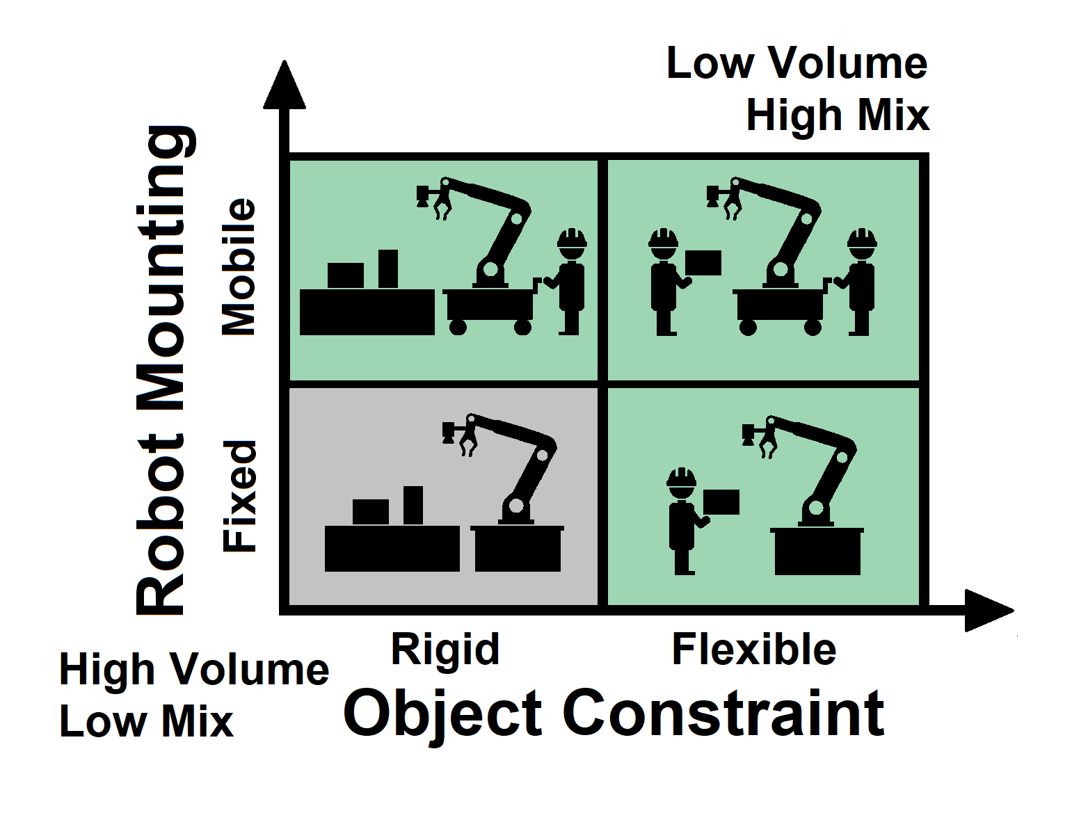 Conventional workcells (gray) require the robot to be fixed-mounted. Objects are either stationary or moving at constant speed on an instrumented conveyor.